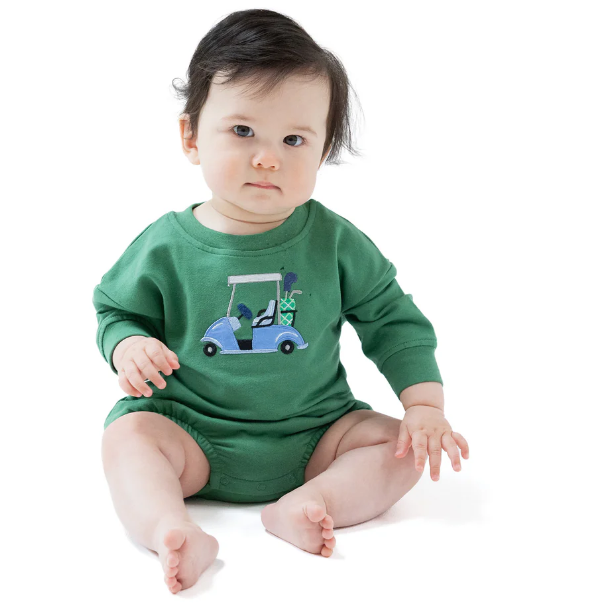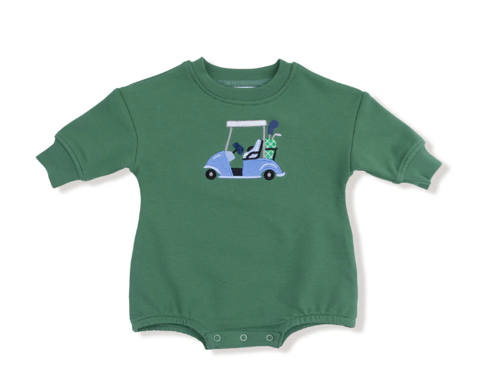 Drive into comfort and style with our Sweatshirt Bubble, crafted from soft French Terry and featuring a playful golf cart applique. This roomy, cozy sweatshirt is perfect for layering on crisp fall and winter days, keeping your little one warm and ready for all their adventures—on or off the green!