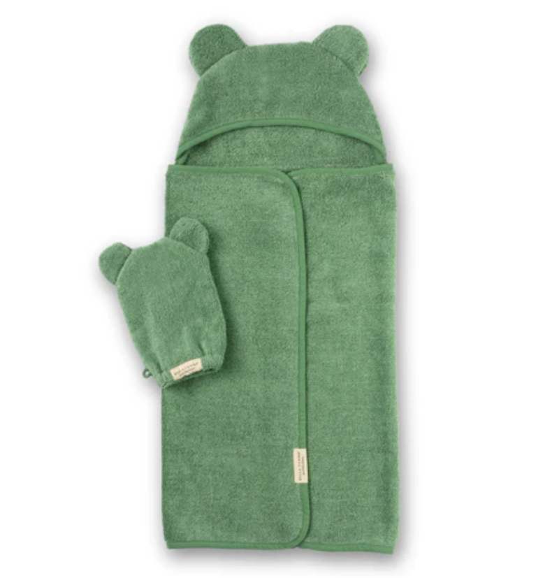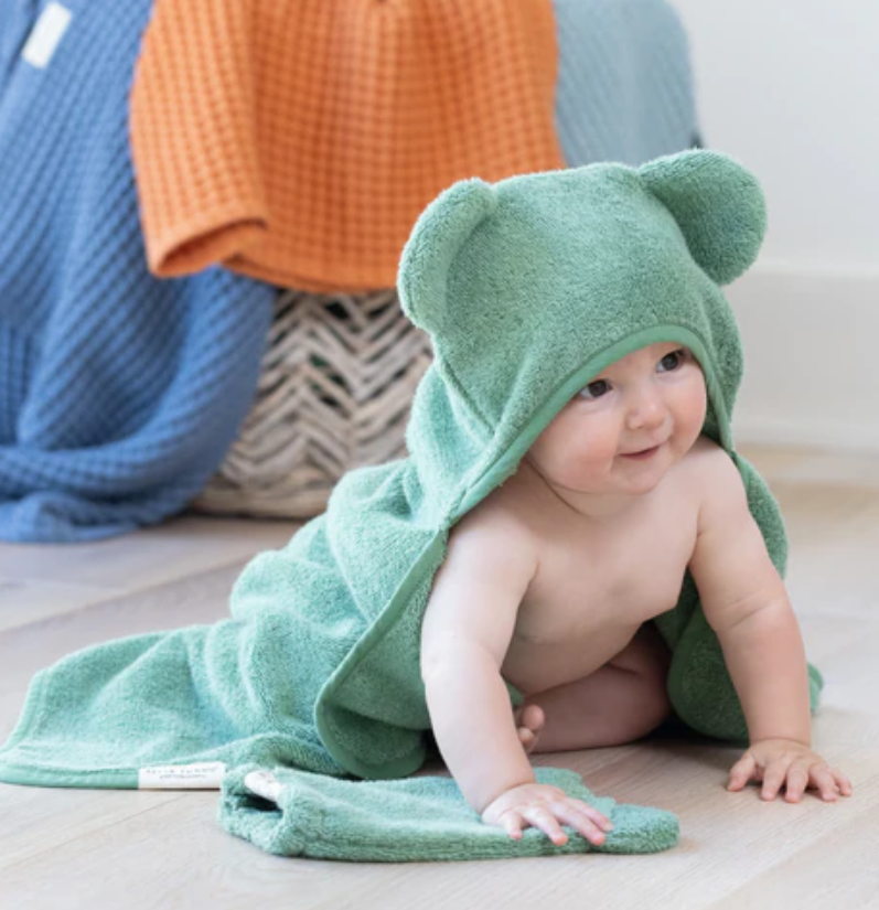 Splish splash! This set includes everything you need for baby’s bath time. Featuring a cozy, ultra-soft hooded towel and coordinating wash mitt. The little ears may not help them listen better, but they sure are cute! Our absorbent terry fabric is made of OEKO-TEX® certified and sustainably sourced cotton and a recycled polyester that keeps 8 plastic bottles out of landfills.