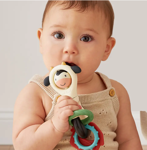 A sensory sensation for your little one! The Itzy Spinner™ is a sensory toy and teether all-in-one. Gentle rattle sounds and a spinning face are sure to captivate. The easy-grip handle turns and clicks keeping tiny hands busy. Soft ears and three clinking rings are textured to provide relief to sore gums. An all-purpose companion for your little adventurer! Great for: Valentine's Day Gifting, Easter Gifting, and Birthdays